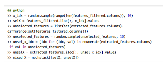 위 코드처럼 FRESH 알고리즘이 기각한 특징 목록 중 10개를 무작위로 선택하여 결합하고, 총 20개 특징에 대해 RFE를 수행하면 중요도 순위를 알아낼 수 있다.
