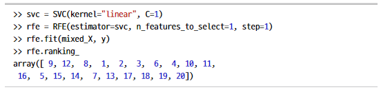 다른 방법으로는 재귀특징제거법(RFE)이 있다. 점진적으로 특징을 선택하고,