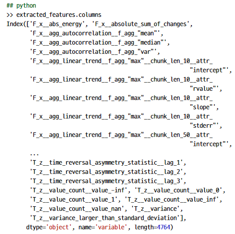 파이썬의 tsfresh 모듈은 기술 통계학, 비선형성과 복잡성 지표, 기록 압축 개수 등을 알아볼 수 있다. 뿐만 아니라 여러 패키지들이 있다.