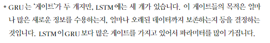 RNN의 문제점 (경사 소멸, 경사 폭발)을 GRU LSTM이 모두 해결해준다.