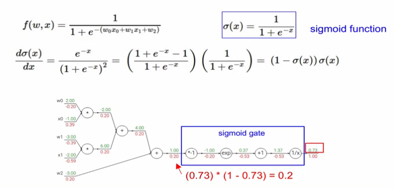 sigmoid function은 미분하면 자기 자신으로 표현이 됨. 그러므로 sigmoid gate를 다 거치지 않고 미분을 한 수식에 대입해서 local gradient를 구할 수 있음.