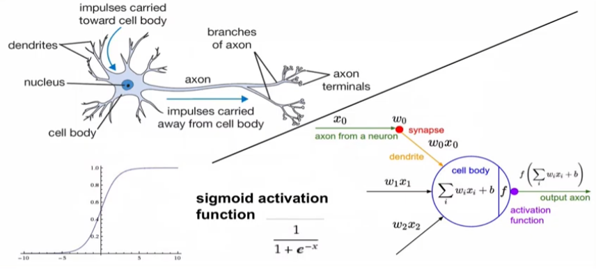 input vector와 weight 곱 -> cell body (sum) -> activation (non-linear) -> output (next neuron)