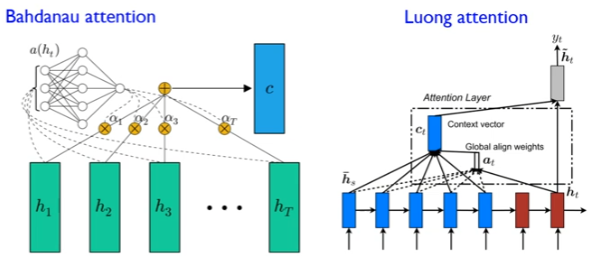 Luong attention : 모델 학습을 하지 않고 단순 곱셈 연산으로 attention score를 만드는 구조 (실용적)
