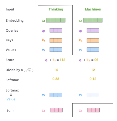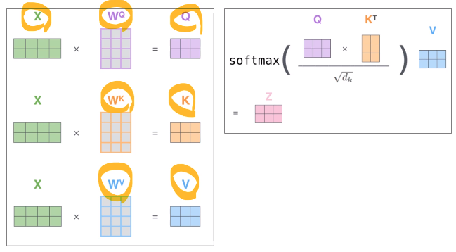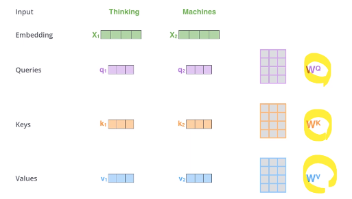 - input imbedding으로부터 각각의 해당되는 matrix가 존재. thinking이라는 x1에 wq를 곱하면 q1이 나오게 됨
