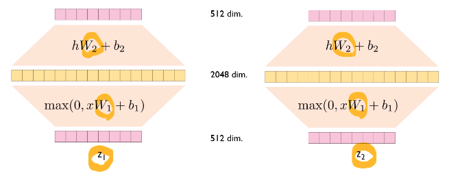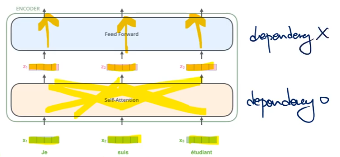 - feed-forward layer에서는 연관이 없음 -> 병렬화 가능 (각 feed-forward에서는 weight가 공유되는 하나의 dense layer를 거침, 다른 encoder계층에서는 weight가 공유되지 않음)