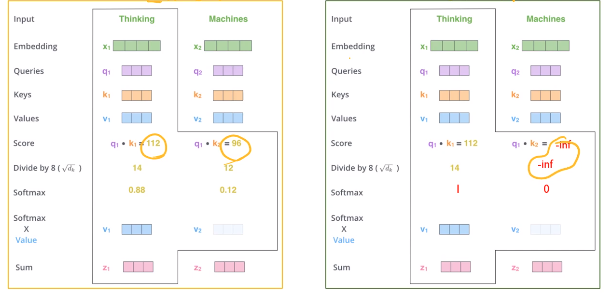- 자기 자신보다 앞 쪽에 해당하는 token들만 attention score를 볼 수 있음.