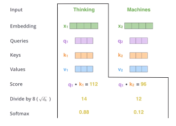 - wq와 input imbedding의 연산으로 quey, key, value의 vector를 학습으로 구하는 미지수.