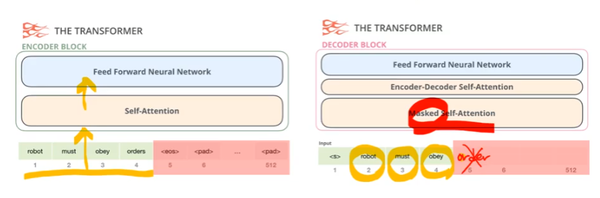 - masked(decoder) : 문장을 생성할 때 앞 -> 뒤로 순차적으로 만들어야하기 때문에 masking이 되어있음.