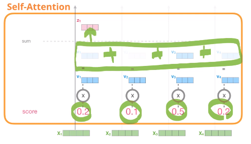 - value vector와 score의 곱으로 나온 vector를 sum하는 이유?