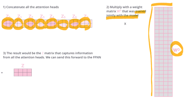 3) 두 matrix를 곱하면 원래 input imbedding의 dimension을 가지는 self-attention의 output을 가지게 됨.