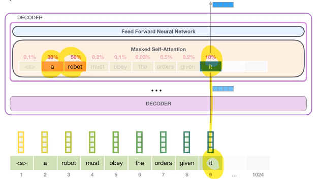 - it이라는 단어가 auto-regressive를 진행하며 masked self-attention이 수행 됨.