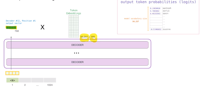 - decoder를 통과한 output vector(768dim)와 token embeddings을 연산을 해서 token probabilities를 구함.