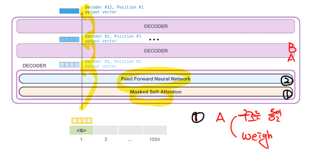 - 1과 A(2와 B)는 구조는 동일. 구조 안에서의 weight는 다름. (decoding block이 다름)