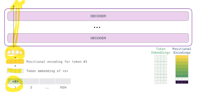 - token embedding + positional encoding -> docoding block를 통과하면서 output을 만들어 냄.