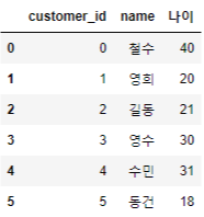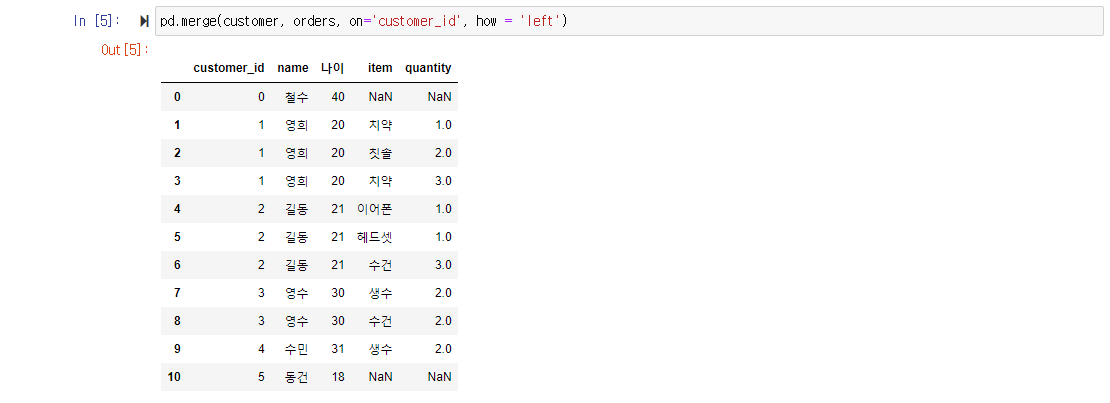기준이 되는 column을 customer_id로 지정하고 how 속성을 left로 지정하면, left dataframe, 즉 첫번째로 지정된 데이터프레임의 customer_id를 key값으로 가져오며, 이를 기준으로 right dataframe을 병합하게 된다.