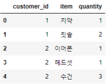 'item' : ['치약', '칫솔', '이어폰', '헤드셋', '수건', '생수', '수건', '치약', '생수', '케이스'], 'quantity' : [1, 2, 1, 1, 3, 2, 2, 3, 2, 1]})
