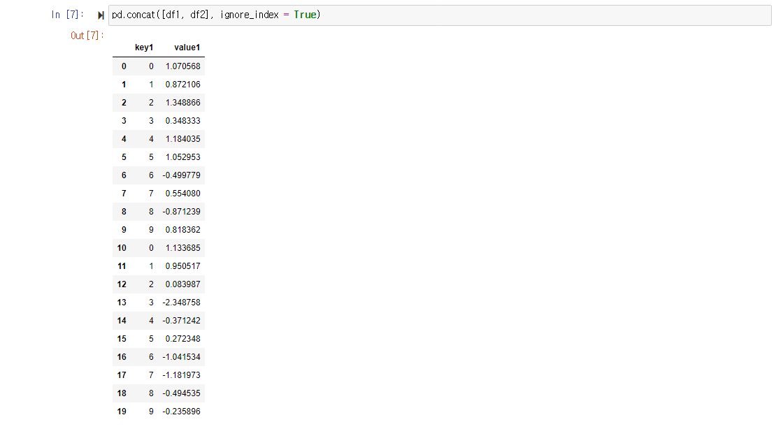 | ignore_index | 각 객체들을 합칠때, 그 객체들의 index 값이 살아있는 채로 이어붙여지게 된다. 만약 이 값을 True로 지정해주면, 기존의 index값을 무시하고 zero-based index가 붙여지게 된다. |