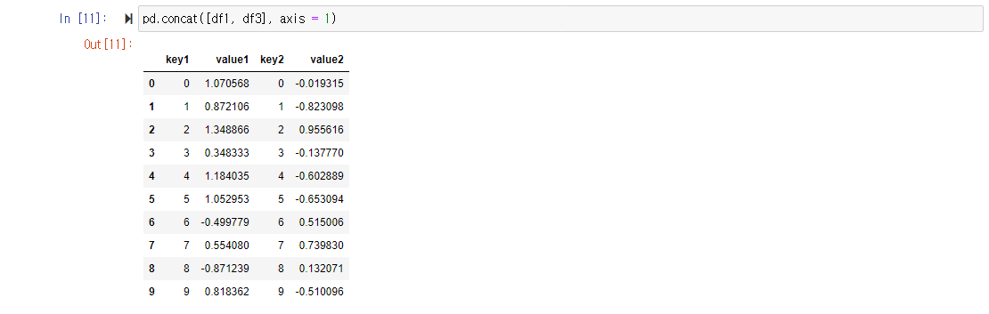 | axis | objs에 들어가있는 객체들을 합칠 방향 (axis = 0 : row방향, axis = 1 : column방향) |
