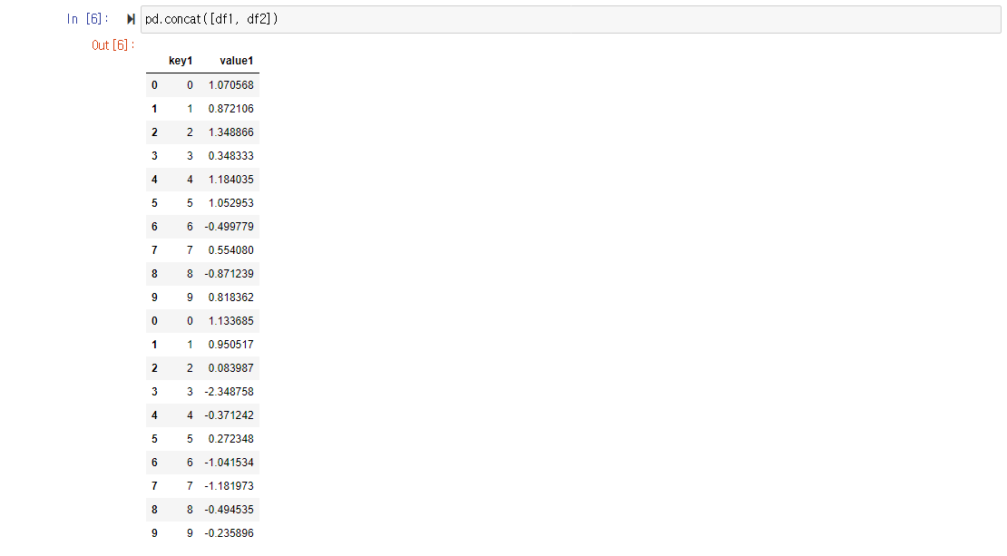 objs에 지정한 객체 순서대로 데이터들을 병합한다. 만약 이 데이터들의 column이 동일한 경우, 새로운 column을 만들지 않는다. concat함수는 default로 row기반으로 연결되기 때문에, 기존에 만들어졌던 column바로 밑에 이어 붙이게 된다.