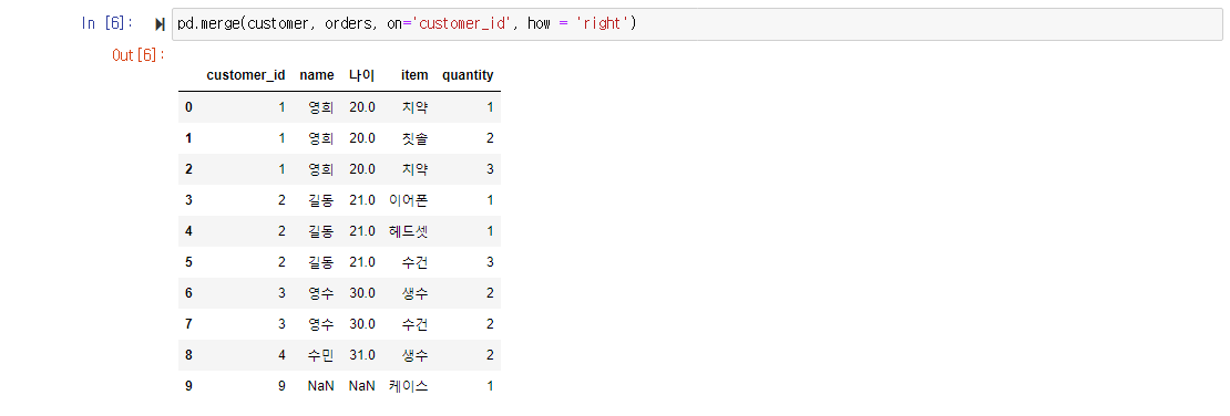 how의 속성을 right로 지정하면, 두번째로 지정된 데이터프레임의 customer_id를 key값으로 가져오게되며, 이를 기준으로 left dataframe을 병합한다.