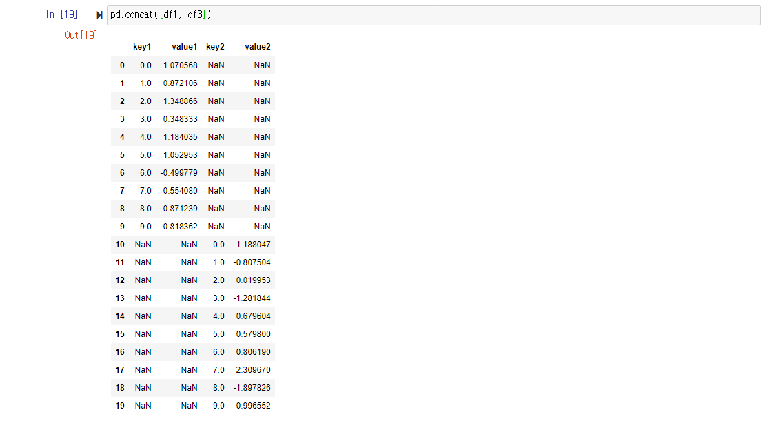 column이 다를 경우에는 새로운 column을 만든다. concat함수를 사용하여 데이터를 병합할 때는, default로 row기반으로 연결되기 때문에, 새로운 column이 만들어져도 이전 객체 바로 옆에 붙지 않는다. 이전 객체의 index에는 모두 NaN 값이 들어가고, 그 바로 밑에 이어서 붙여지게 된다.