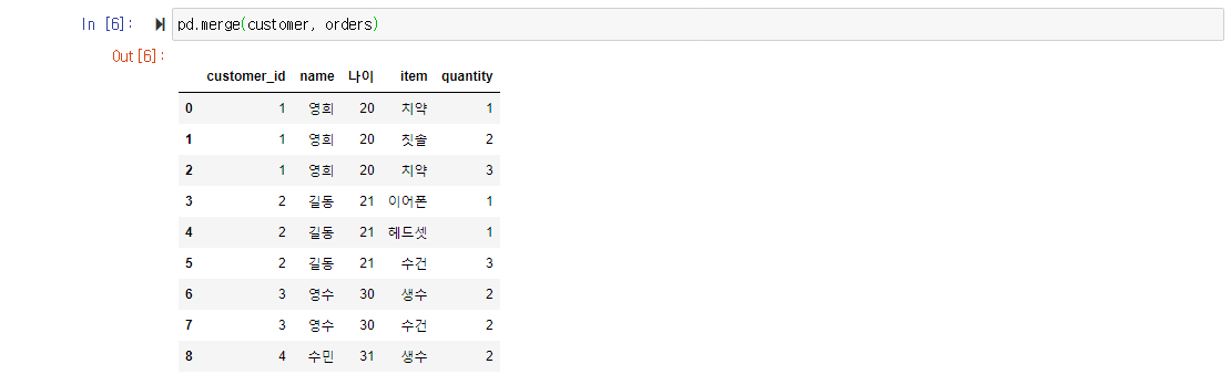 how는 기본적으로 inner이 default값이기 때문에 아무 조건없이 두 dataframe을 병합하면 customer와 orders의 column이 동일한 customer_id를 key값으로 삼는다. 아래 예제에서 on으로 기준이 되는 column 명을 customer_id로 지정해도 아래와 같은 결과가 나온다. (양쪽 dataframe에서 기준이 되어야 하는 column값이 서로 다르다면, 각각 left_on, right_on을 사용한다.)