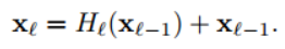 - ResNet의 l번째 layer 출력값은 위와 같고 H()함수는 conv, bn, relu 함수의 연산을 의미. + xl-1은 skip connection에 의한 덧셈.