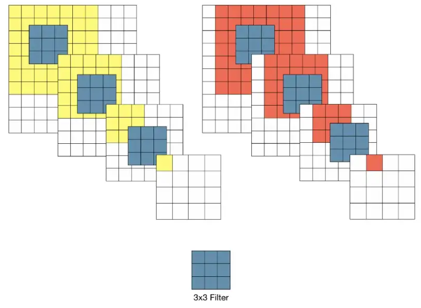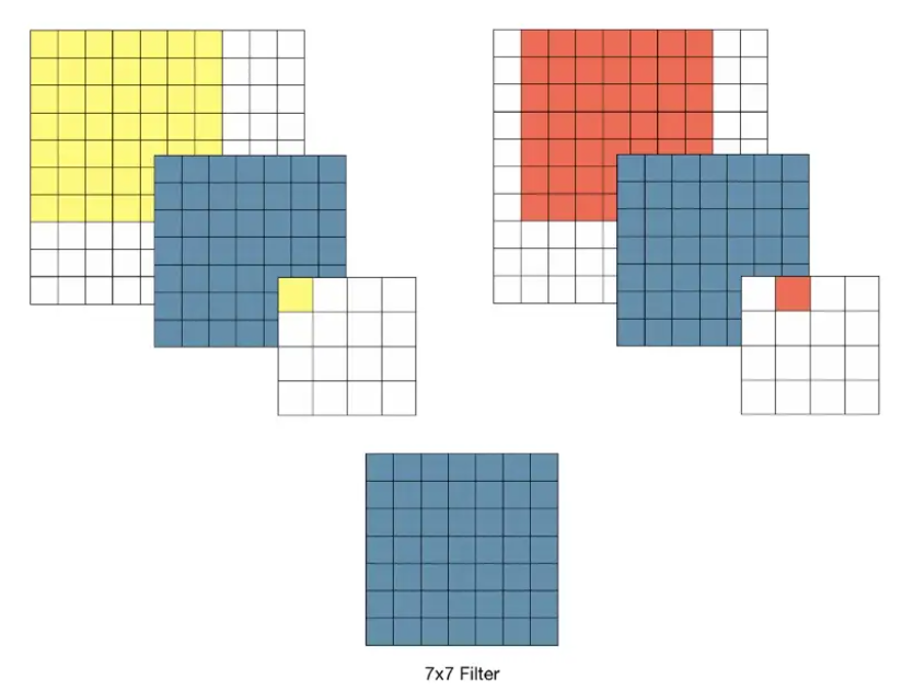 - 3x3필터를 이용할 경우 3-layer Conv을 반복했을 때 원본 이미지의 7x7영역을 수용할 수 있음. (stride가 1일 때, 3차례의 3x3 Conv 필터링을 반복한 feature map을 한 pixel이 원 본 이미지의 7x7 receptice field 효과를 볼 수 있다.)