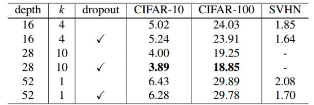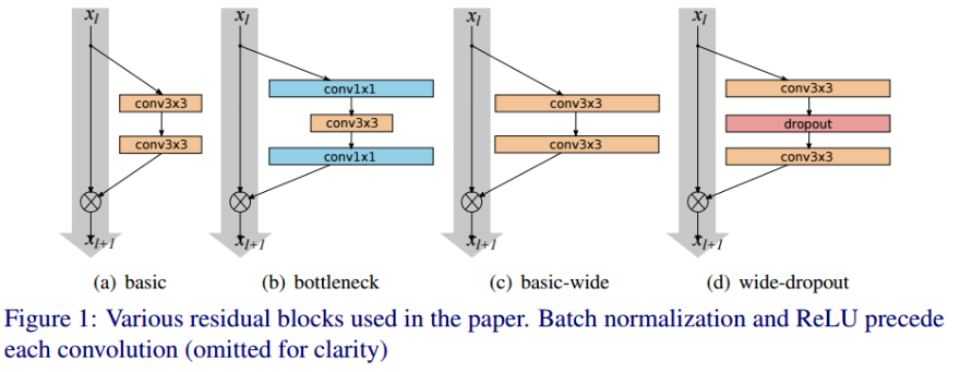 - (c)와 (d)가 논문의 residual block. Pre-activation resnet에서 제안된 BN-ReLU-conv 활성화함수 사용. 각 Conv layer가 갖고 있는 필터 수 k배. (d)는 conv layer 사이에 dropout을 적용한 구조.