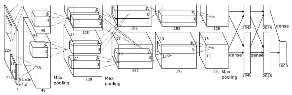 - 구조 : Max-pooling layer가 적용된 5개의 conv layer와 3개의 fully-connected layer로 이루어져 있음.