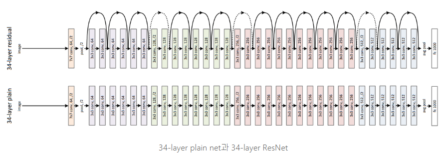 - PlainNet model에 Shortcut connection을 추가하여 구성. input = output 차원이라면 identity shortcut을 바로 사용하면 되지만 dimension이 증가했을 경우 두 가지 선택권이 있음. (zero padding을 적용하여 차원을 키움. 앞서 다뤘던 1x1 Conv를 사용하여 projection shortcut을 사용)