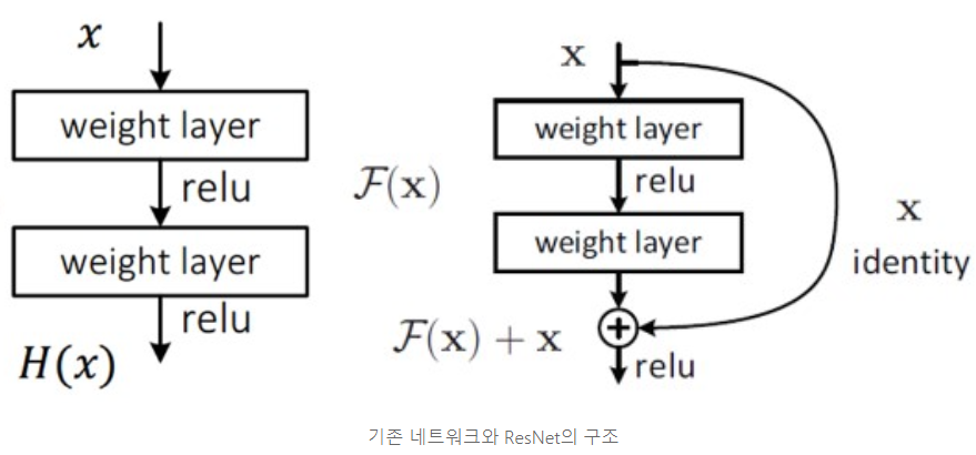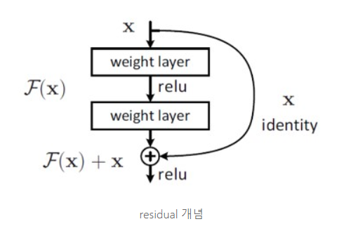 - 기존 네트워크는 입력 x를 받고 layer를 거쳐 H(x)를 출력. Residual Learning은 H(x)가 아닌 출력과 입력의 차인 H(x)-x를 얻도록 목표 수정. 즉 F(x) = H(x) - x를 최소화하는, 출력과 입력의 차이를 줄인다는 의미. x는 값을 바꾸지 못하는 입력값으로 F(x)가 0이 되는 것이 최적해. 0 = H(x) - x => H(x) = x가 되어 H(x)를 x로 mapping하는 것이 학습의 목표