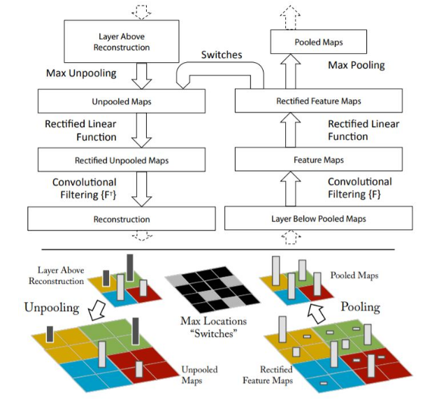 - 위 과정을 역방향으로 똑같이 진행하면 되는데, unpooling시 현재 정보만을 가지고 모든 data를 복원해낼 수 없다는 단점. -> pooling과정에서 가장 강한 자극의 위치정보를 switch라는 곳에 저장하여 unpooling시 해당 위치에 대해서 왼쪽 그림과 같이 복원해낼 수 있게 함.