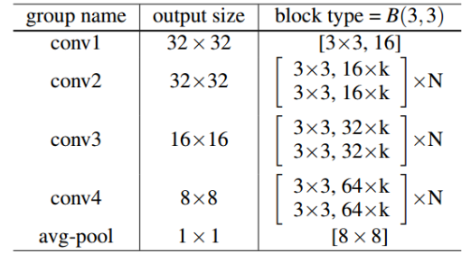 - 해당 table처럼 conv1 이후에 3개의 residual block으로 구성. 기존 conv layer 필터수에 k배를 해줌. N이 깊이를 결정하고, 이는 몇 개의 residual block이 묶여있는지 의미.