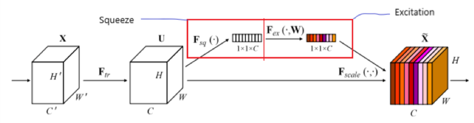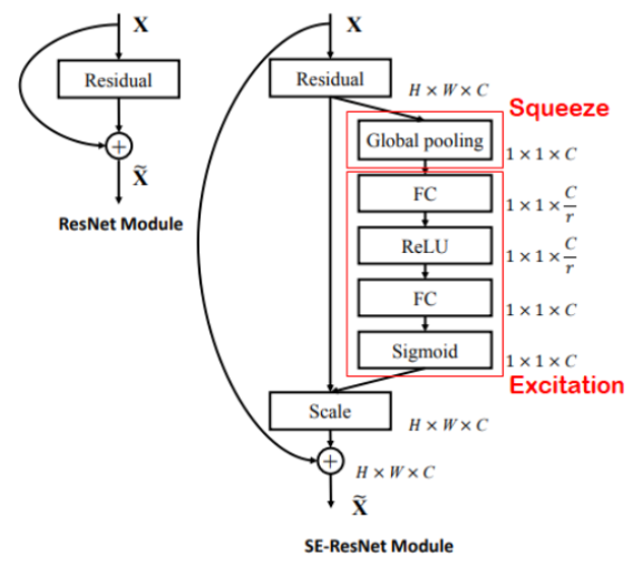 - SE Block : 위 그림처럼 squeeze(압축) + Excitation(재조정) = 채널별 가중치를 계산하고 feature map에 곱해지는 모습.