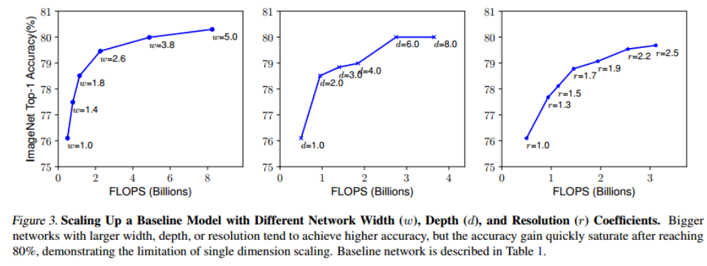 - w(너비),d(깊이),r(입력 해상도)가 일정 값 이상이 되면 정확도가 빠르게 수렴함. 낮을 때는 약간만 값을 조절해도 효과가 큼.