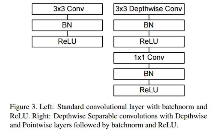 - MobileNet Depthwise separable conv구조로 K*K*M*F*F + M*N*F*F의 연산량을 가짐. (기존 연산량인 K*K*M*N*F*F보다 8~9배 더 적음)