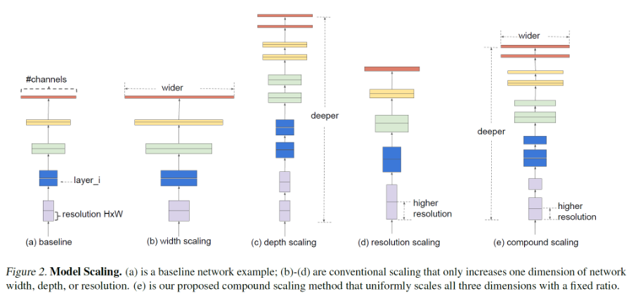 - 일반적으로 모델을 scaling하는 방법은 (b)너비, (c)깊이, (d)입력 해상도 조절