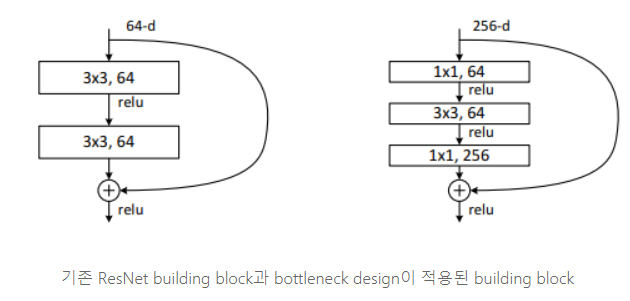 - bottleneck 구조(1x1, 3x3, 1x1로 구성하여) 커널 수는 많아지나 파라미터 수를 대폭 줄여줌. identity shortcut이 bottlenect 구조를 더 효율적인 모델로 만들어줌.