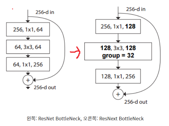 - 왼쪽 ResNet BottleNeck 구조를 오른쪽처럼 변형한 것