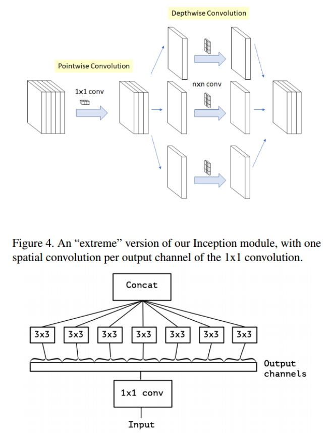 - 간소화하면 위와 같이 나타낼 수 있음. 이를 1x1 conv는 cross-channel correlation을 계산하고, 3x3 conv는 spatial correlations을 수행하는 것. -> 기존 Inception module이 좋은 성능을 나타내는 이유는 위 2개를 잘 분해해서 계산했기 때문이라고 함.