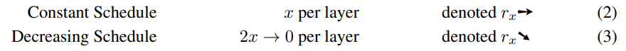 이를 보았을 때, constant($ r $의 값이 중간에 바뀌지 않는 것)가 최적에 가까웠고, 특히 병합된 total token이 클수록 더욱 최적에 가까웠다. 모델이 3배 이상의 처리량을 감당하게 만들기 위해서는 linearly decreasing 방법이 효과가 좋은 것을 알 수 있었다. 처음에는 $ 2r $ 토큰을 첫번째 layer에서 제거하고, 마지막 layer에서는 0개의 토큰을 제거하는 “decreasing” schedule을 정의하였다. 그리고 그 사이에서는 interpolation으로 제거해야 할 토큰의 개수를 정한다. 이것은 동일하게 $ rL $토큰을 제거하지만, 기존보다 더 빠르게 처리할 수 있는 방법이다.