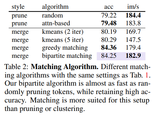 Table 2에서는 bipartite matching을 다른 token reduction algorithm과 비교하는 실험을 진행하였다.
