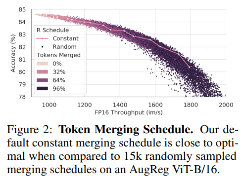 기본값으로는 토큰을 한 layer에서 일정한 수($ r $) 만큼을 줄이는 schedule 방법을 사용하였다. 이 디자인의 최적화를 평가하기 위해서 15,000개의 merging schedules를 표본 추출(?)하였다. 각 schedule에서 AugReg ViT-B/16 모델을 사용하여 정확도와 fp16 (Imagenet-1k val)을 측정하였다.