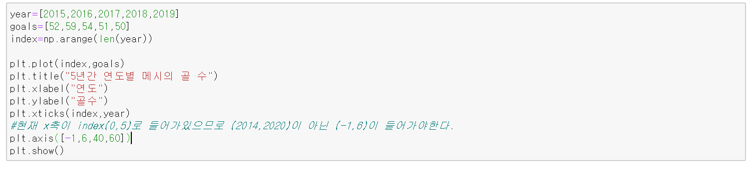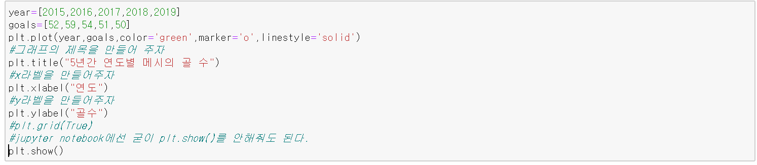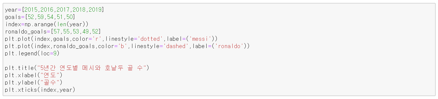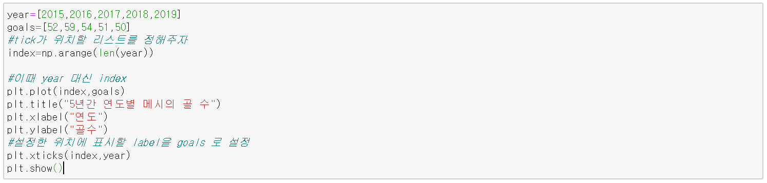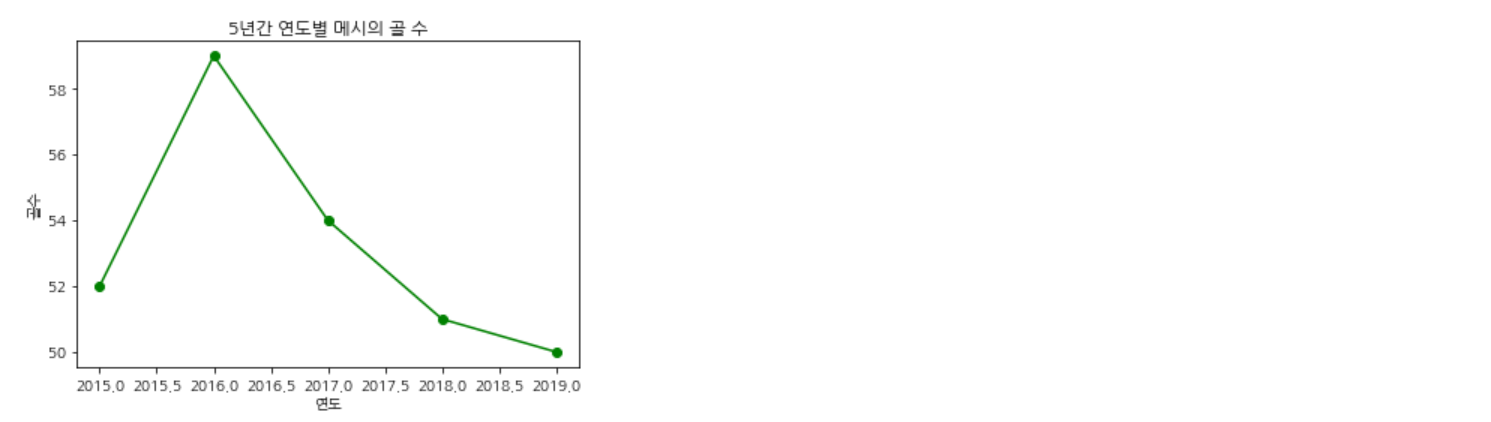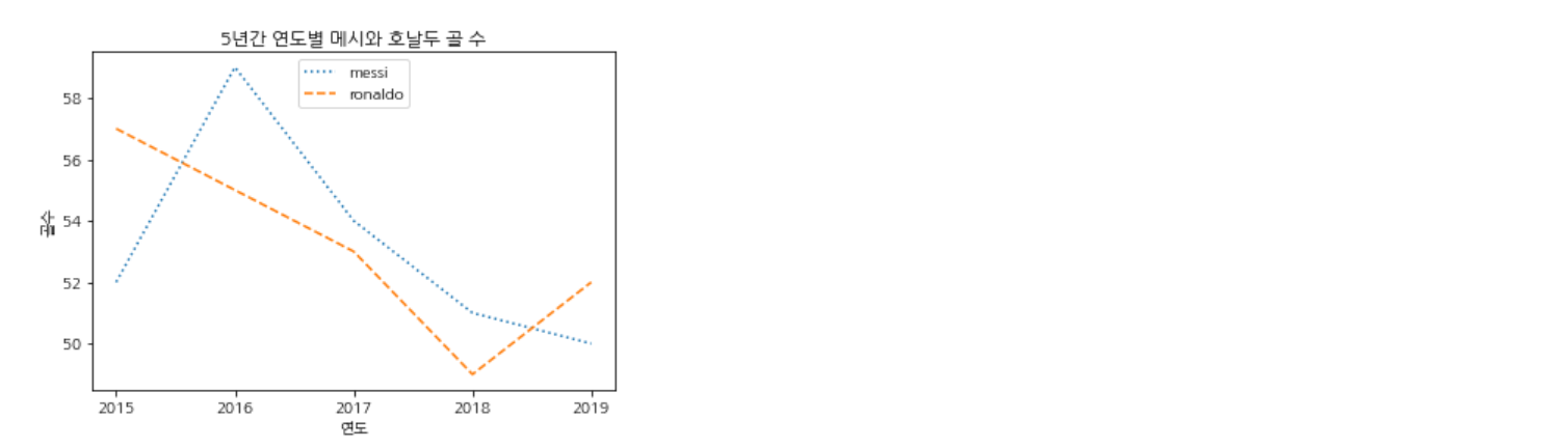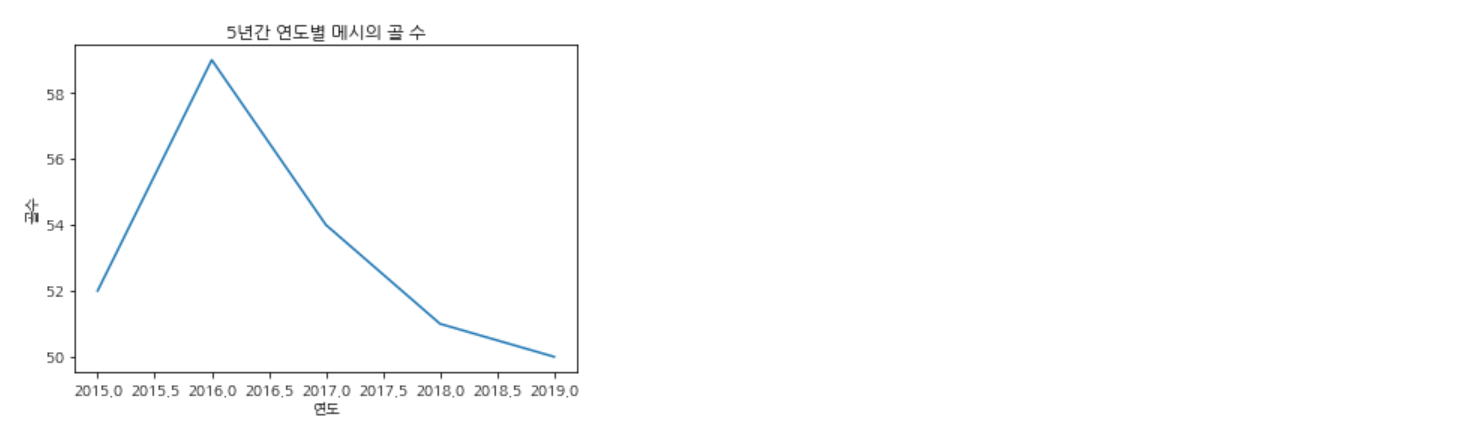 아래 코드는 5년간 연도별로 축구선수 메시의 골 수를 선 그래프로 시각화한 것이다.