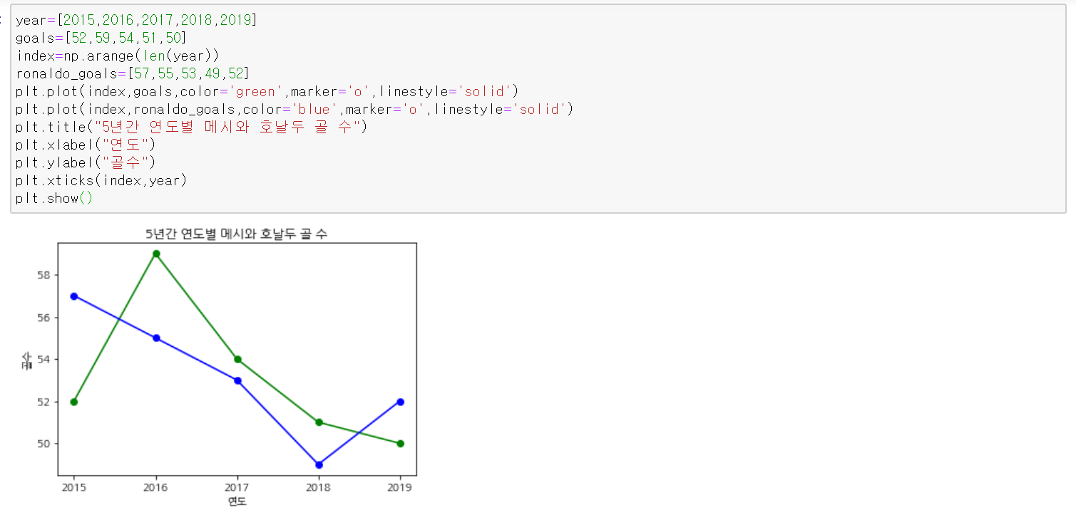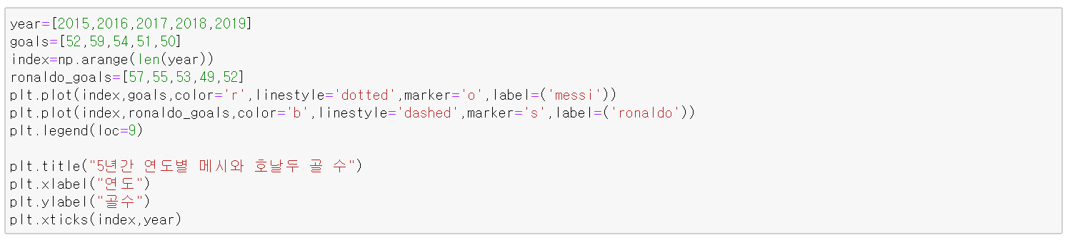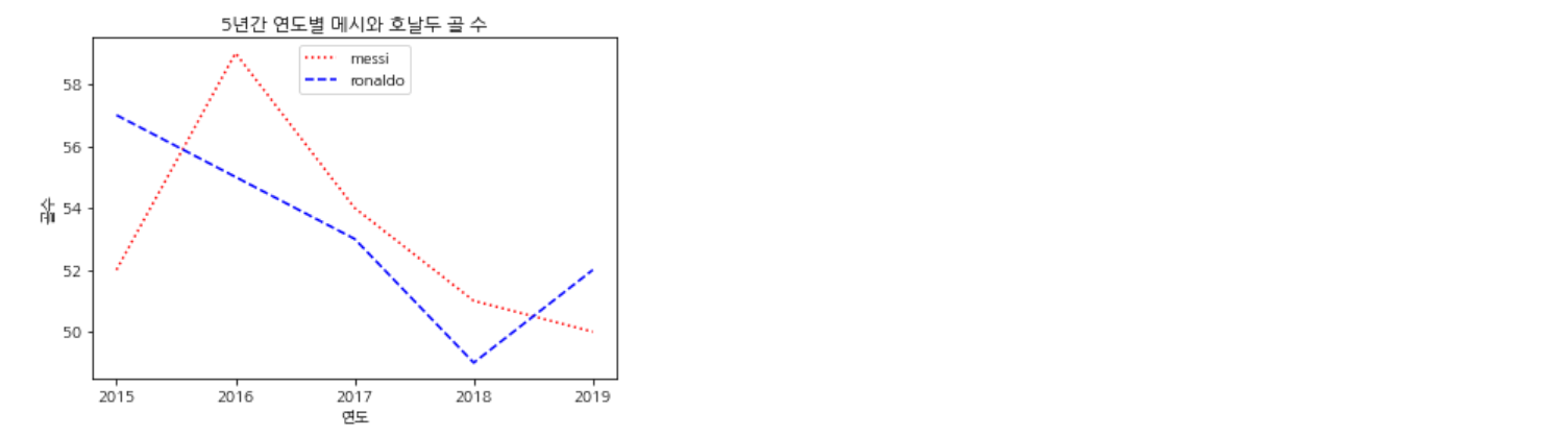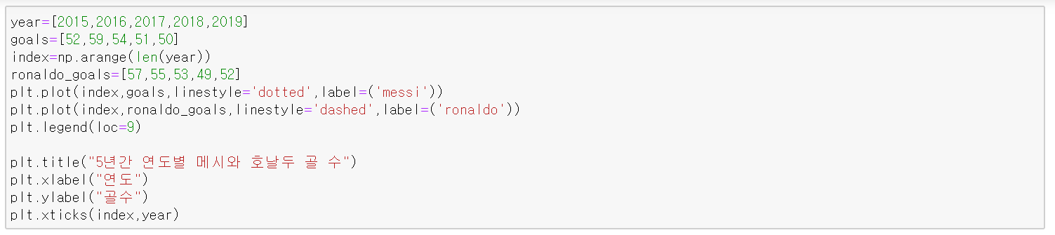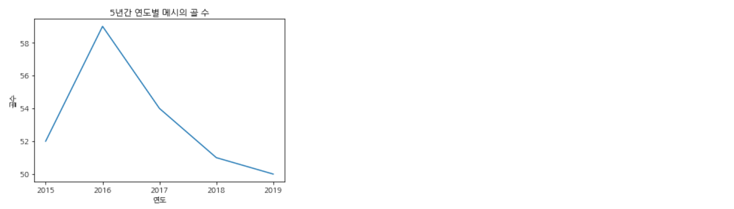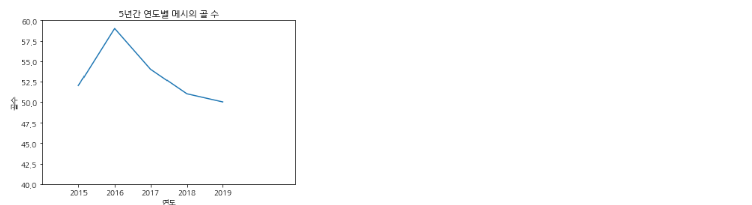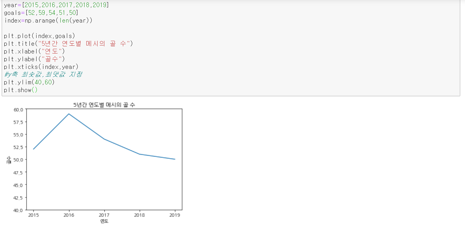 아래 코드는 5년간 연도별로 축구선수 메시의 골 수를 선 그래프로 시각화한 것이다.