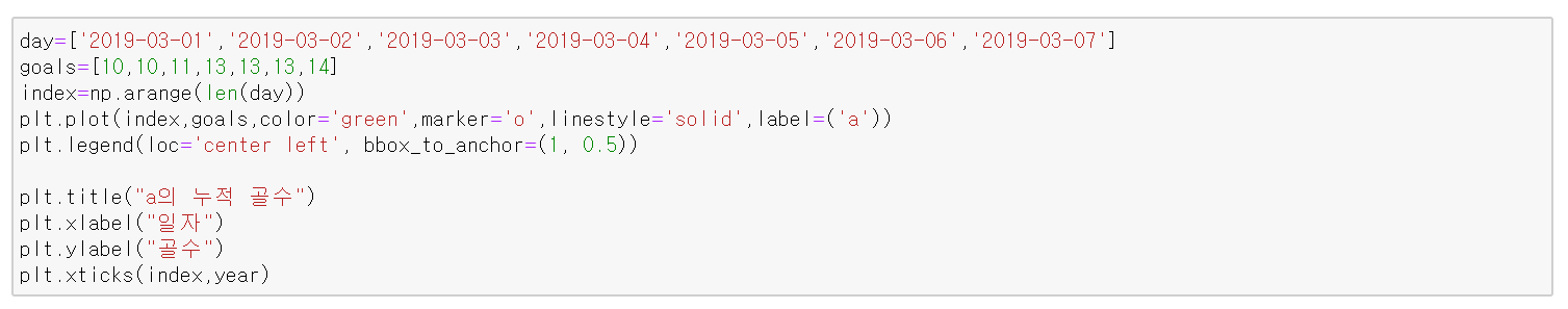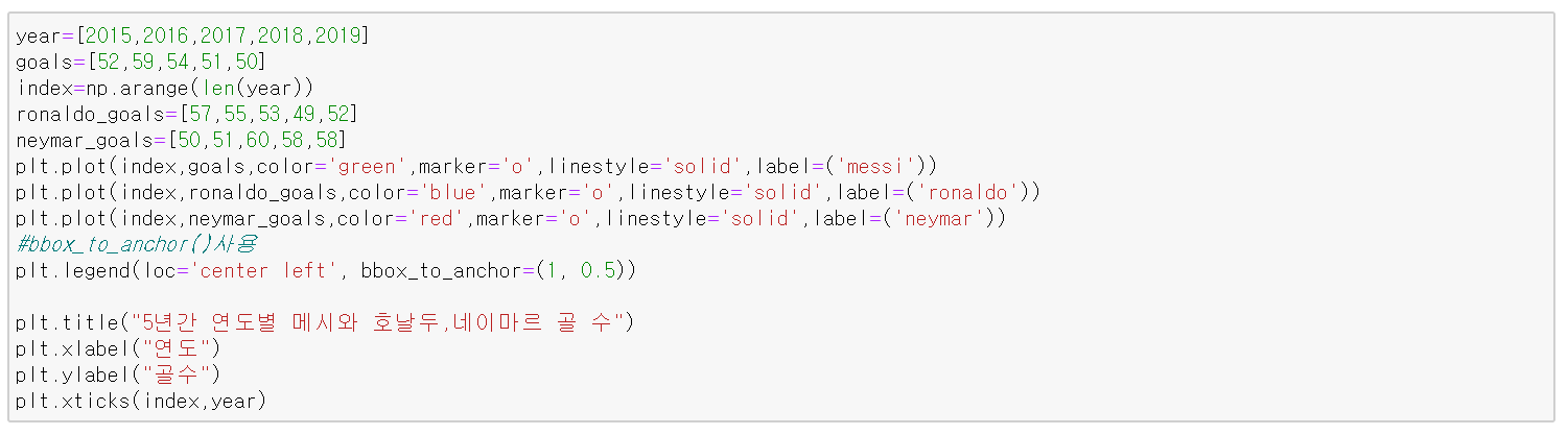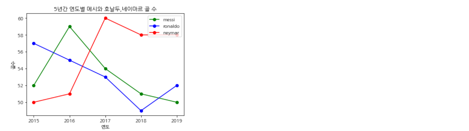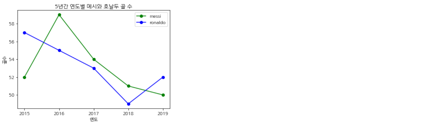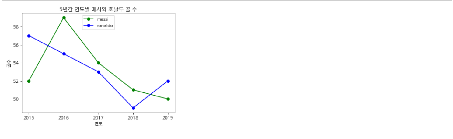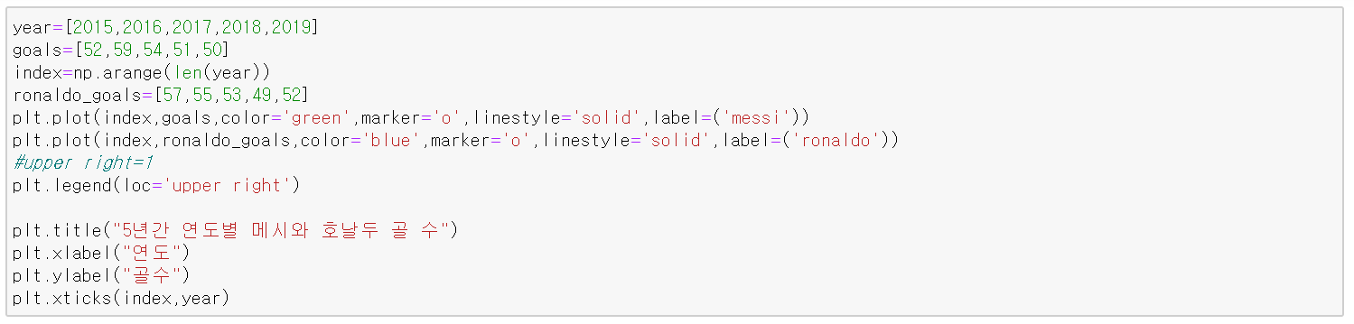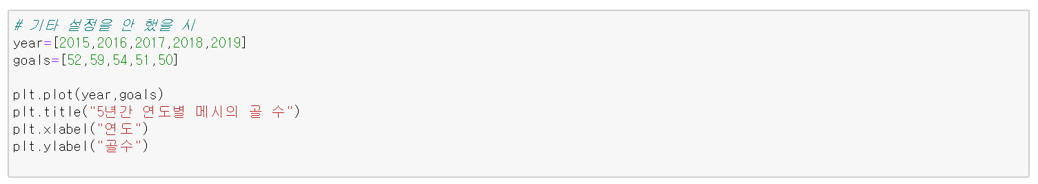 아래 코드는 5년간 연도별로 축구선수 메시의 골 수를 선 그래프로 시각화한 것이다.