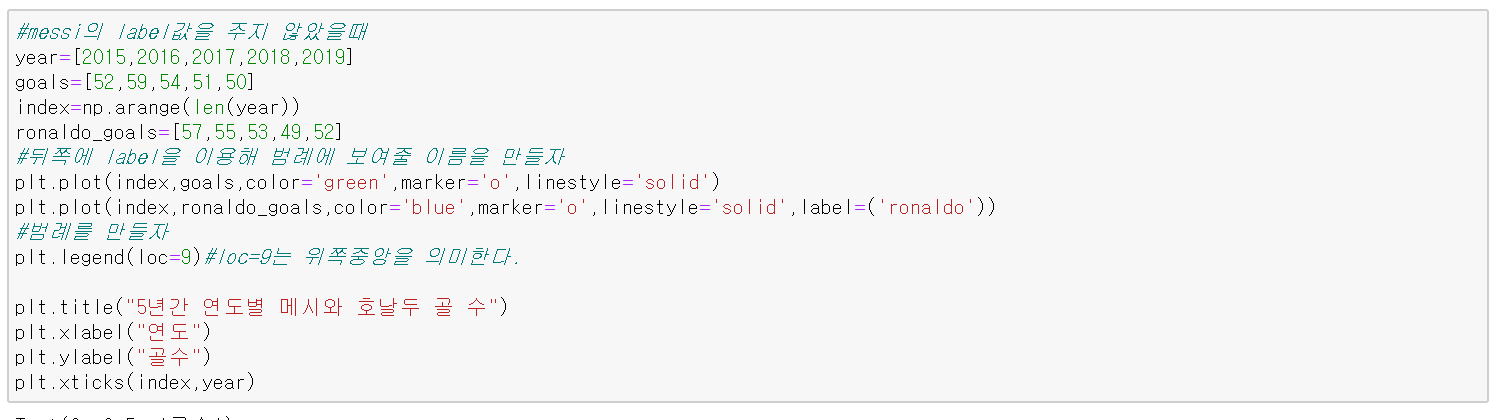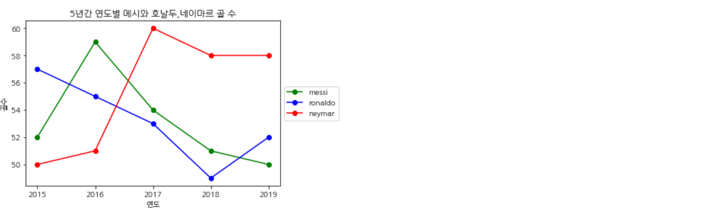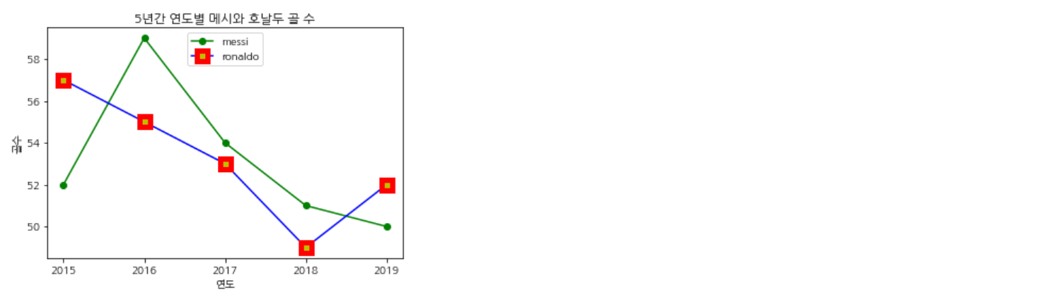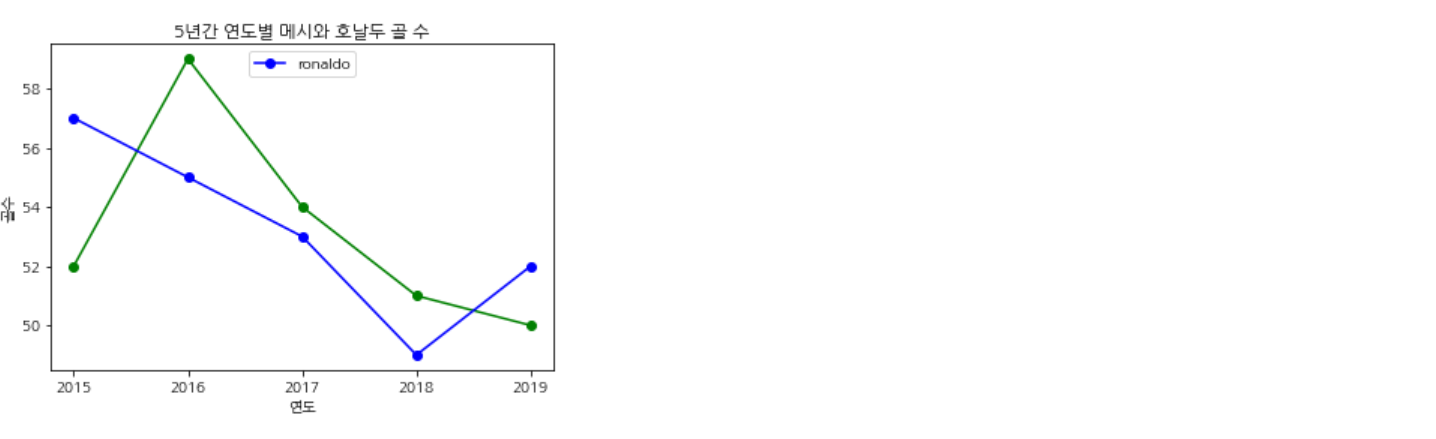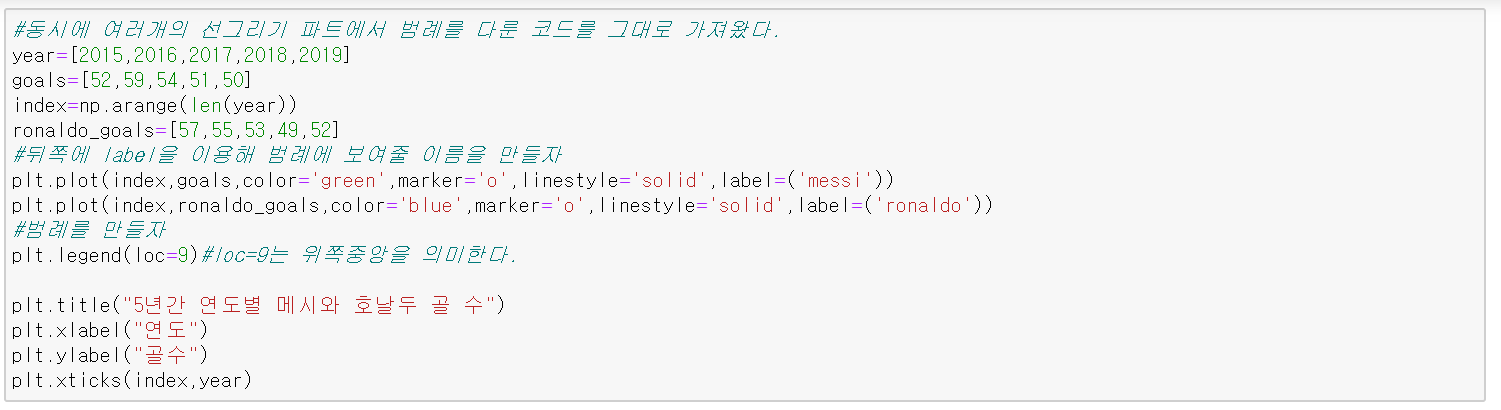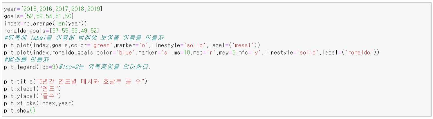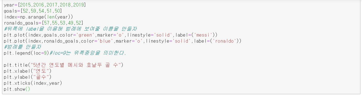 그냥 그래프를 그려주는 것은 처음과 똑같이 plt.plot을 사용해주면 된다. 하지만 그냥 그리기만 한다면 어떤 게 메시의 골이고 어떤 게 호날두의 골인지 모를 것이다. 이때 우리는 범례(legend)를 만들어 줘야 된다.