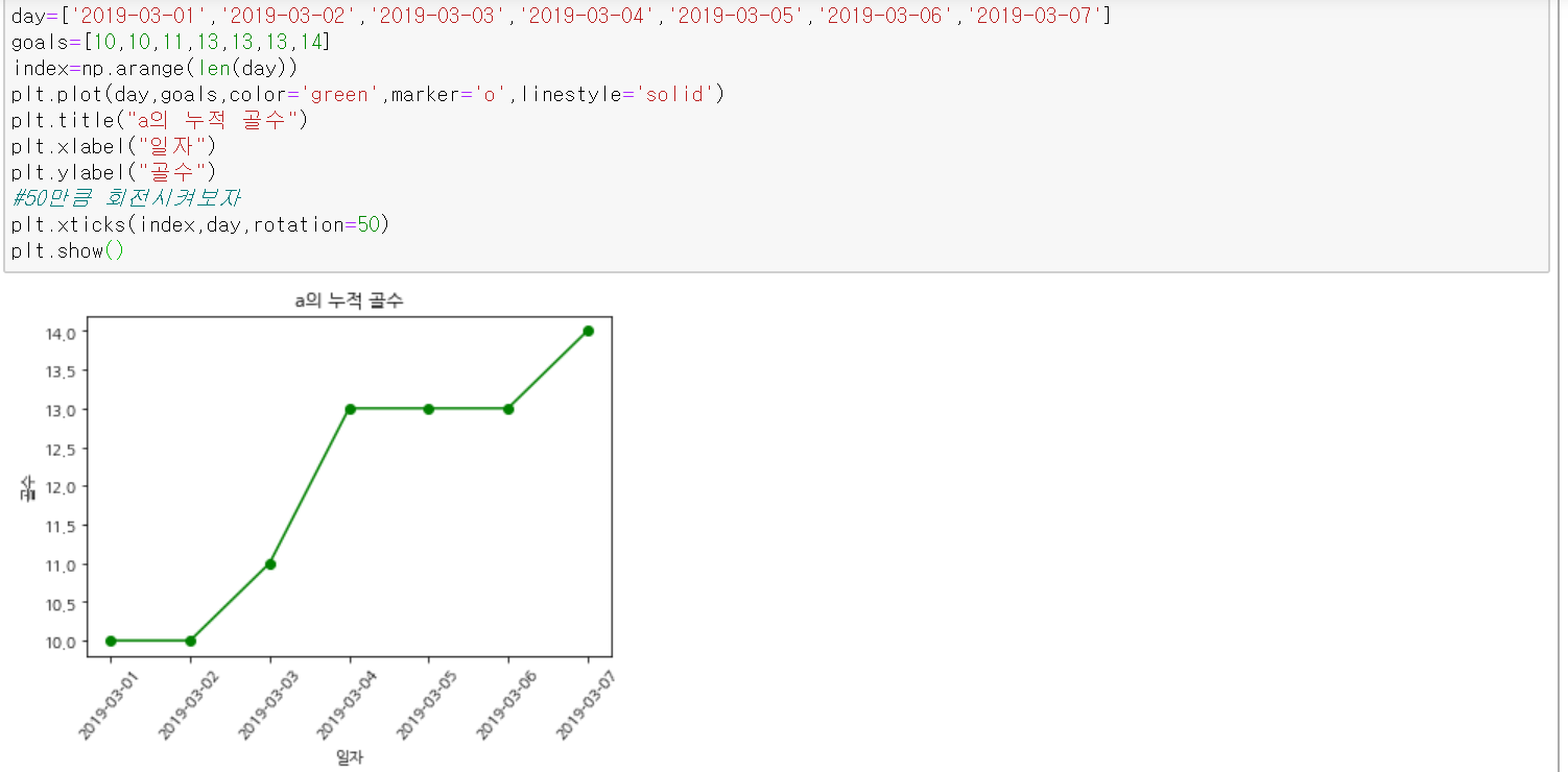 - 기타 설정들의 예로는 위 코드에서 color, marker, linestyle이다. color는 선의 색깔, maker는 값이 찍히는 곳의 모양, linestyle은 선의 모양을 정할 수 있다.