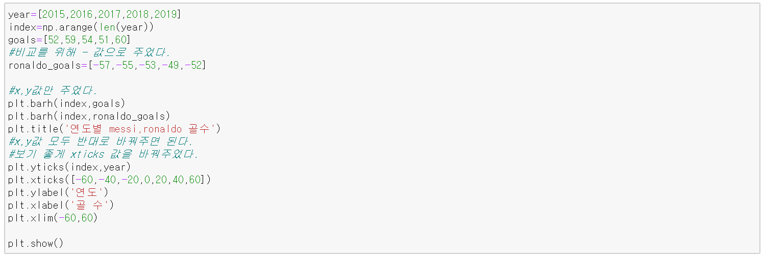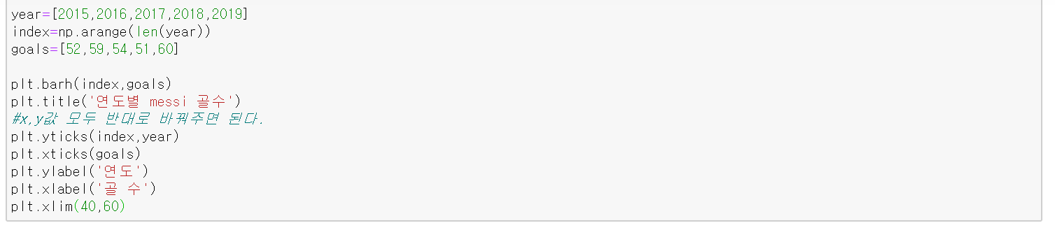 만약 막대를 가로로 뻗어나가게 그리고 싶다면 bar(x, y) 대신 barh(x, y)를 사용하면 된다. 몇 가지 인수들이 다른 거 말고는 동일하다.